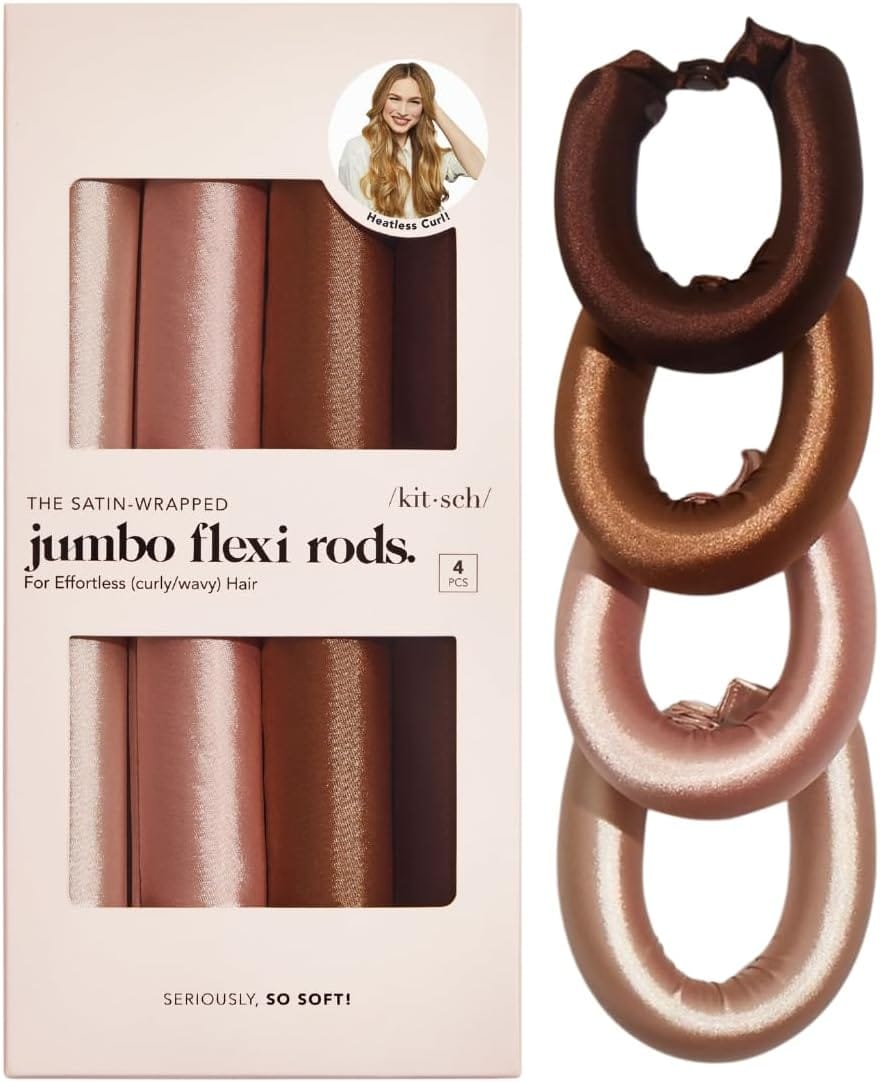 The Kitsch Jumbo Heatless Hair Curler set comes with four satin flexi rods, perfect for creating big and bouncy curls without heat. The flexible design eliminates the need for pins or clips, making it comfortable to wear day and night.