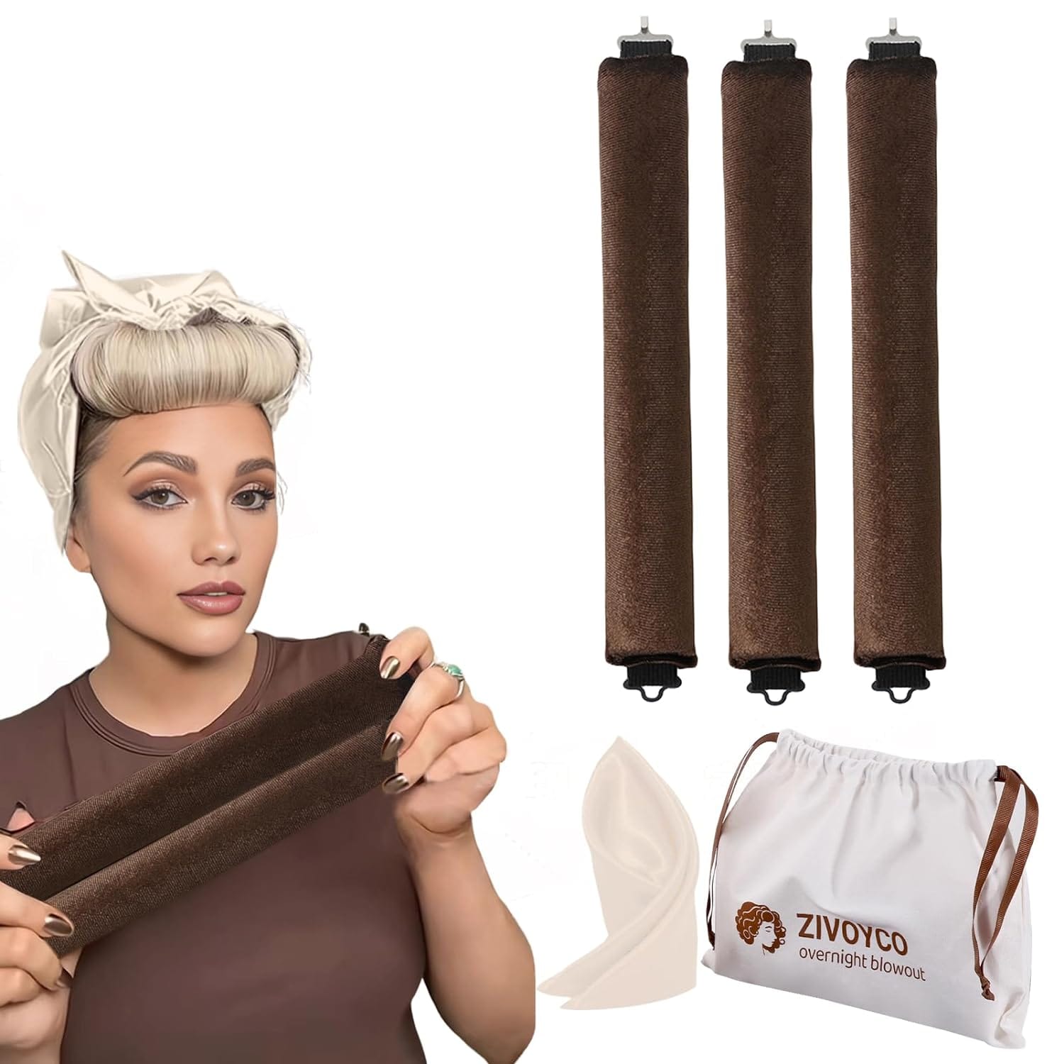 The Heatless Hair Curler Overnight Blowout Curls Rods set comes with 3 velvet curling rods, a headband, and a silk scarf. The velvet material is gentle on hair and ensures comfortable wear throughout the night or day.
